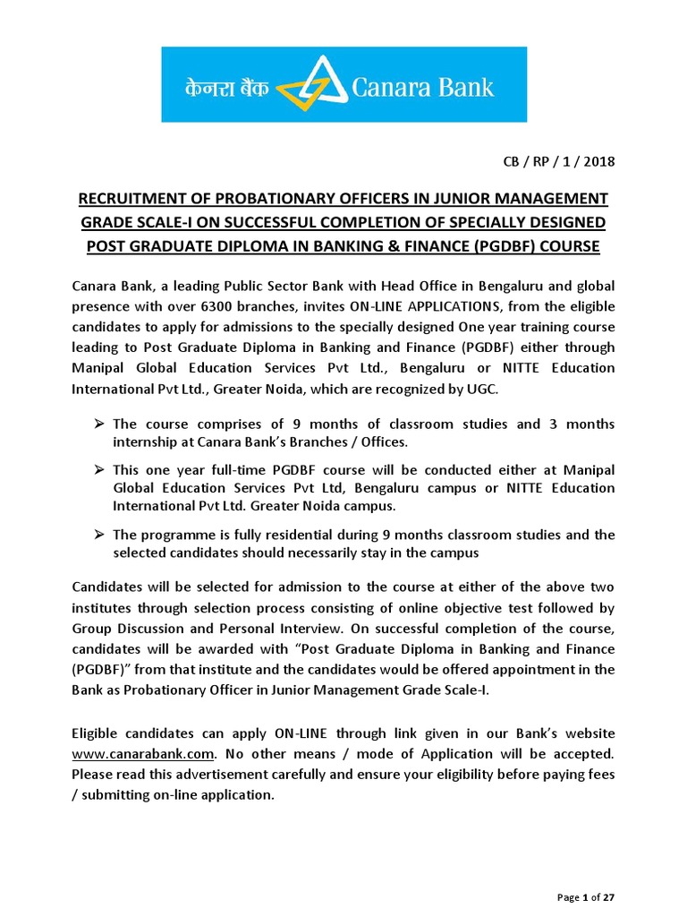 Canara Bank Po Recruitment 2018 Application For 800 Probationary