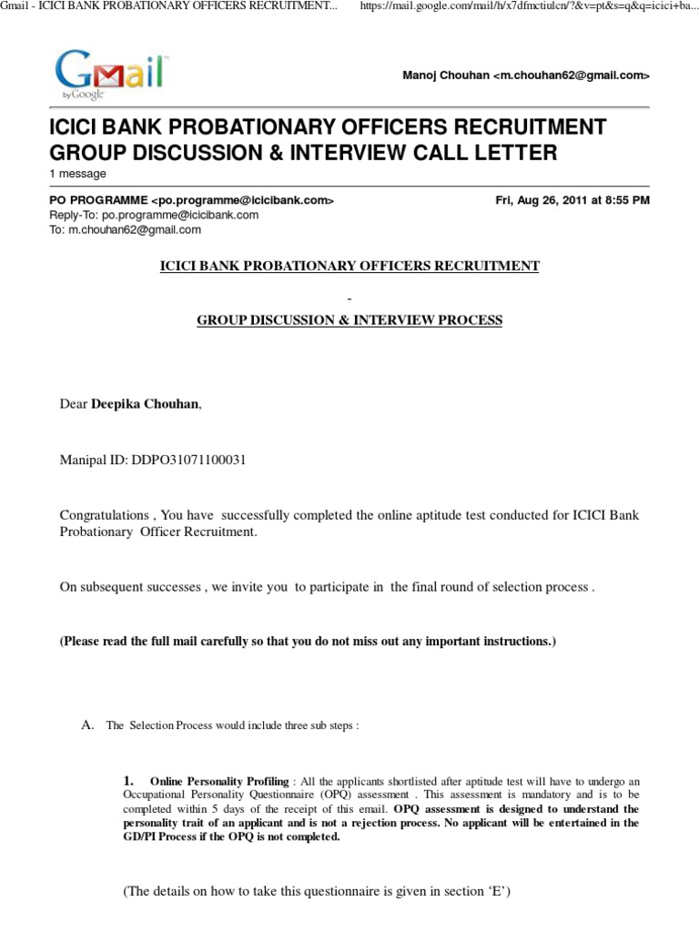 Gmail Icici Bank Po Gd Pi Call Letter Email Login