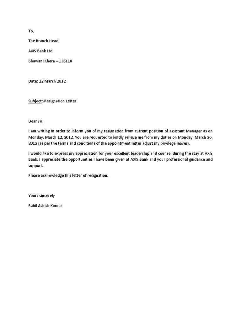Resignation Letter For Branch Manager